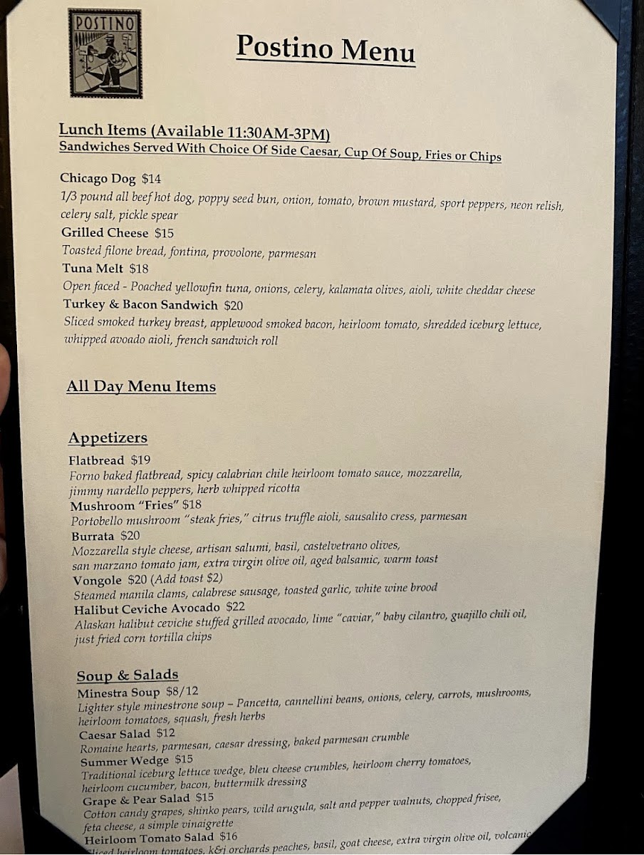 Located in Lafayette, California, Postino Restaurant offers a delightful dive into Italian cuisine, masterfully blending classic flavors with innovative twists. Their all-day menu showcases comforting options like the hearty Soup of the Day, featuring Italian butter beans and rainbow chard, and the refreshing Arugula Salad topped with fried sunflower seeds for a crunchy finish.